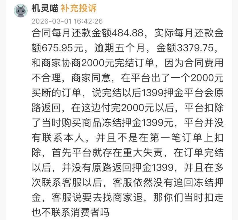 押金监管不透明、管理不规范,不仅可能导致用户权益受损,也会影响平台的声誉。例如,一位用户在黑猫投诉平台反映,“合同每月还款金额484.88,实际每月还款金额675.95元,逾期五个月,金额3379.75,和商家协商2000元完结订单,因为合同费用不合理,商家同意,在平台出了一个2000元买断的订单,说完结以后1399押金平台会原路返回,在这边付完2000元以后,平台扣除了当时购买商品冻结押金1399元,平台并没有联系本人,并且不是在第一笔订单上扣除,首先平台就存在重大失责,在订单完结以后,并没有原路返回押金1399,并且在多次联系客服以后,客服依然没有追回冻结押金,客服说要去找商家退,那你们当时扣走也不联系消费者吗?”