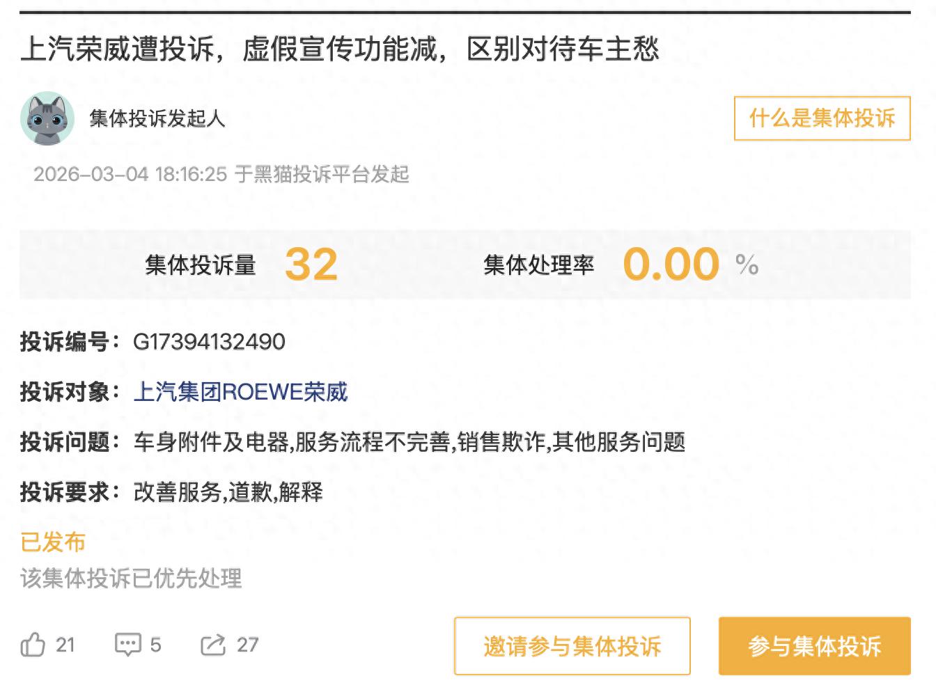 本次集体投诉的核心事实,均来自车主公开提交的投诉材料。截至发稿,该集体投诉的集体处理率仍为0%。