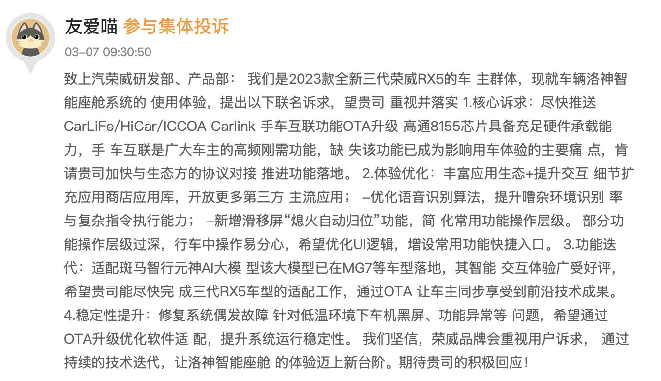 此番对于荣威的集体投诉,表面上看是车机系统的一次维权,背后也是对荣威产品全生命周期维护能力的不断考验。