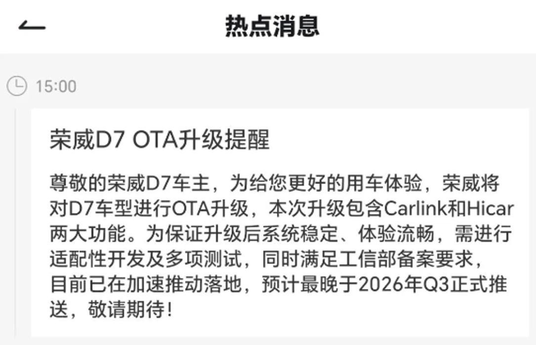 目前,已有车主称,上汽荣威已就D7车型的OTA升级问题作出承诺,将新增Carlink和Hicar功能,预计最晚于2026年Q3正式推送,理由为“为保证升级后系统稳定、体验流畅,需进行适配性开发及多项测试,同时满足工信部备案要求”。