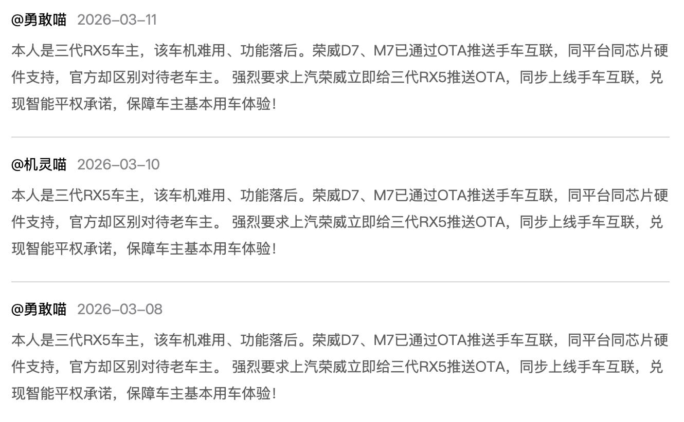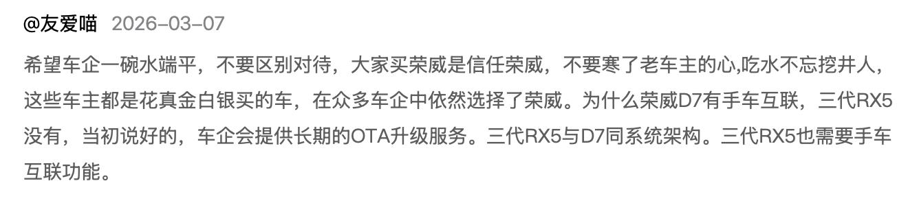此消息一出,更引发了荣威RX5车主的不满,有车主称,“希望车企一碗水端平,不要区别对待”, 还有不少车主要求,“上汽荣威立即给三代RX5推送OTA,同步上线手车互联,兑现智能平权承诺,保障车主基本用车体验。”