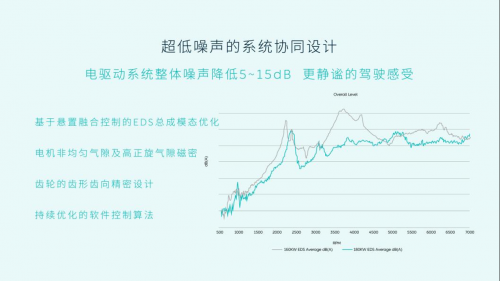 Richy介绍到,相比于160kW老款电驱系统,180kW已通过悬置融合控制的EDS总成模态优化、电机非均匀气隙及高正旋气隙磁密、齿轴结构优化设计和控制器谐波注入与控制策略等优化,实现噪音控制。