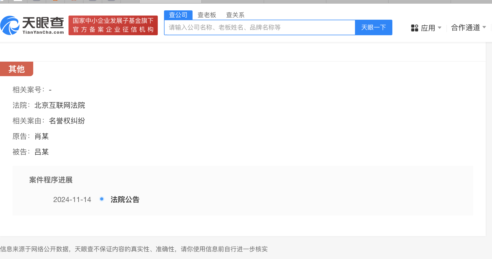 天眼查App显示,11月14日,因吕某某未履行致歉义务,肖战申请强制执行,北京互联网法院公告肖战与其名誉权纠纷案件判决书。