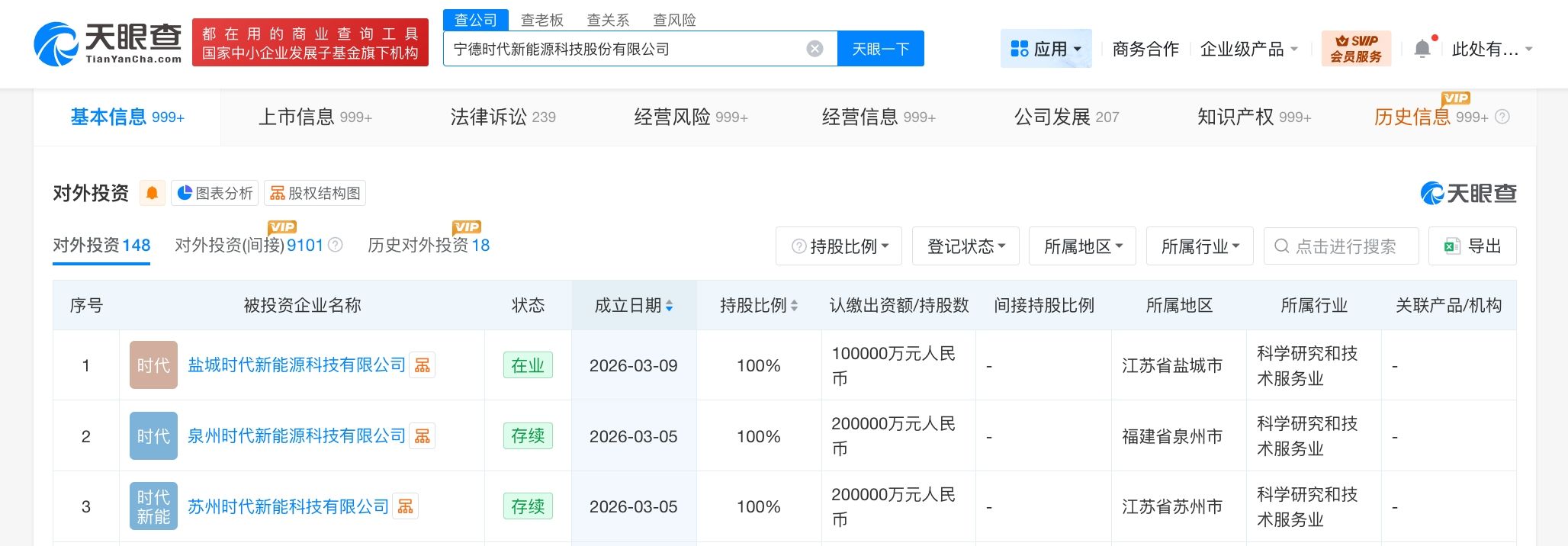 天眼查工商信息显示,3月9日,盐城时代新能源科技有限公司成立,法定代表人为陈凌,注册资本10亿人民币,经营范围包括电池制造、电池销售、新兴能源技术研发、电子专用材料制造、货物进出口等。股东信息显示,该公司由宁德时代(300750)全资持股。