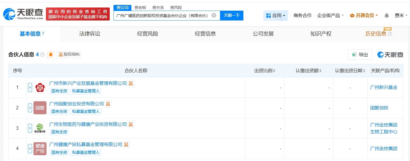 天眼查工商信息显示,近日,广州广健医药创新股权投资基金合伙企业(有限合伙)成立,执行事务合伙人为广州国聚创业投资有限公司、广州健康产投私募基金管理有限公司,出资额5亿人民币,经营范围为创业投资,以私募基金从事股权投资、投资管理、资产管理等活动。合伙人信息显示,该基金由广州市新兴产业发展基金管理有限公司、广州国聚创业投资有限公司、广州生物医药与健康产业投资有限公司等共同出资。