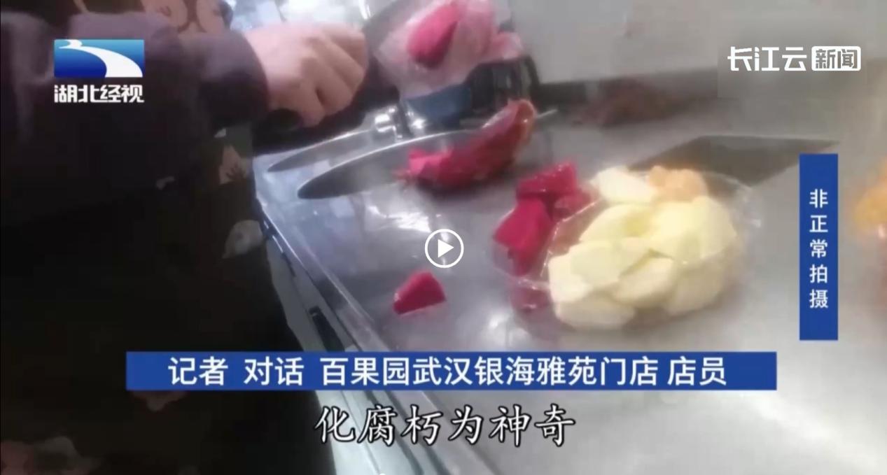 节目显示,该台记者应聘入职百果园武汉银海雅苑店,无健康证也可上岗。在工作区域的双开门小型冰箱中,摆放着不新鲜、有伤口、腐烂的水果。