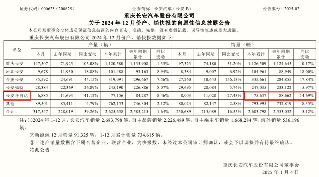 长安马自达声称其2024年销量同比增长8%,而长安汽车的公告显示长安马自达全年销量为7.56万辆,同比下滑14.69%。这种数据上的矛盾不仅让外界对长安马自达的销量真实性产生质疑,也暴露了其在数据管理和信息披露上的问题。