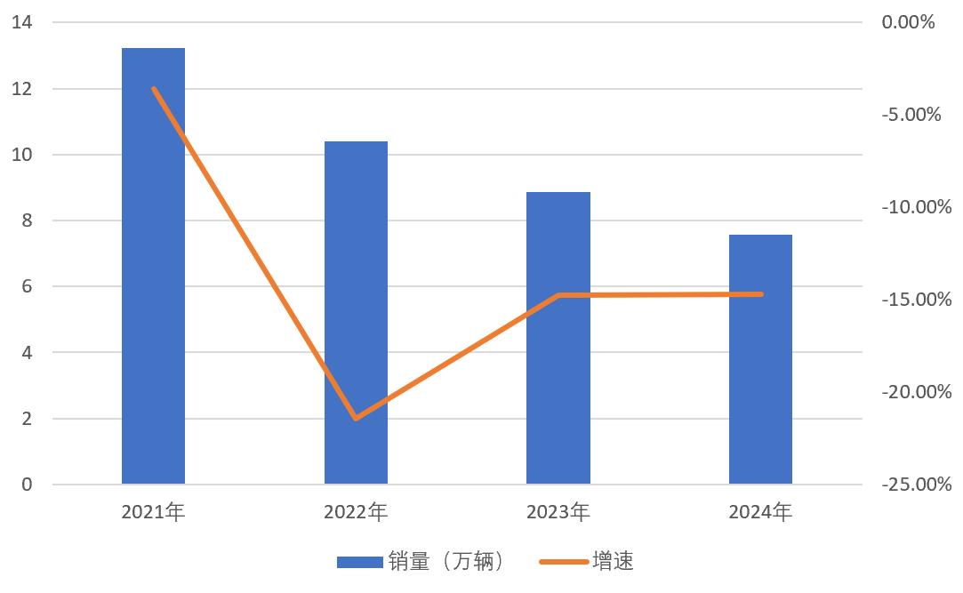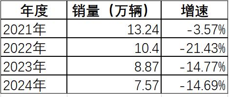 2021-2024年长安马自达销量和增速(来源:长安汽车年度产销报告)