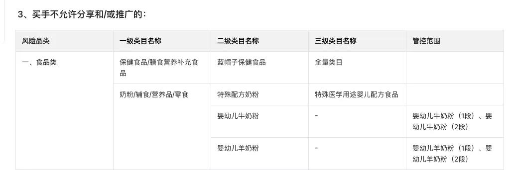 在食品类别中,新规明确指向保健食品/膳食营养补充食品类目,其中带“蓝帽”标志的保健食品,全量类目禁止买手分享或推广。