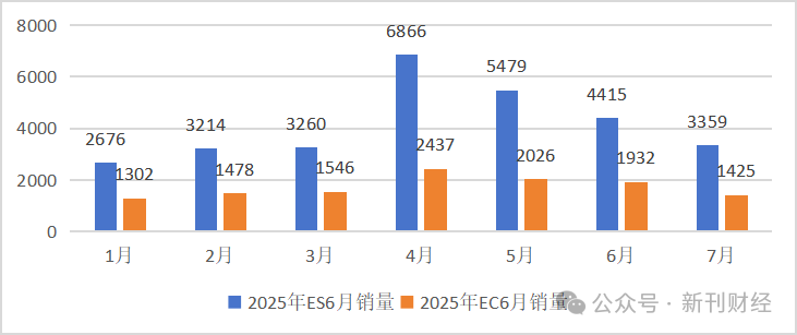 随着时间的推移和更多竞品的陆续上市,其市场热度有所回落。2025年上半年,ES6累计销量为25,910辆,较2024年同期下降18.80%;EC6累计销量为10,721辆,同比下降8.38%。7月单月,ES6和EC6销量分别为3,359辆和1,425辆,同比降幅达58.59%和45.49%。尽管蔚来通过多种促销手段维持销量,但在各方竞争压力下,这两款产品的销量正逐步下降。