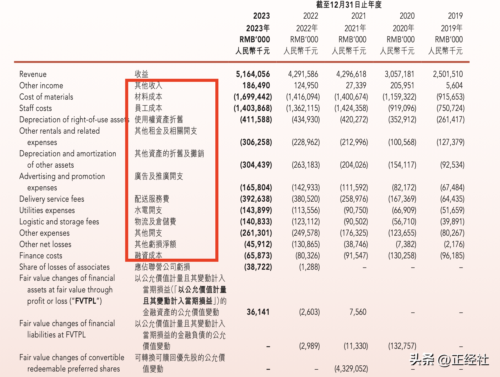 与此同时,摊子铺大了,成本代价问题也随之而来。从财报来看,2023年奈雪的茶多项支出均有增加,材料成本、员工成本、租金开支、广告和推广开支、水电物流甚至连配送服务费也是增长的。真应了那句话:只有你想不到,没有它花不到。