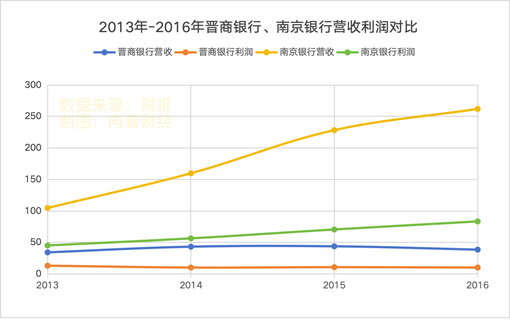 举个例子,2013年到2016年,晋商银行营收增加至39亿,净利润却下滑至10亿。同期,南京银行营收从105亿增长至262亿,净利润从45亿增长至83亿。