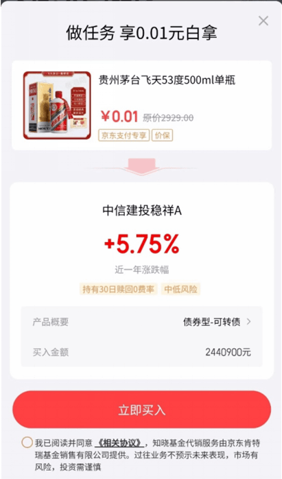 不过,用户真的可以1分钱拿下价值几千元的飞天茅台吗?实则不然。京东金融以1分钱“白拿”活动为噱头,诱导消费者购买高达244.09万元的债券基金。除了茅台,其他一分钱白拿商品也需要购买债券基金,不同商品购买的债券基金数目还不同。