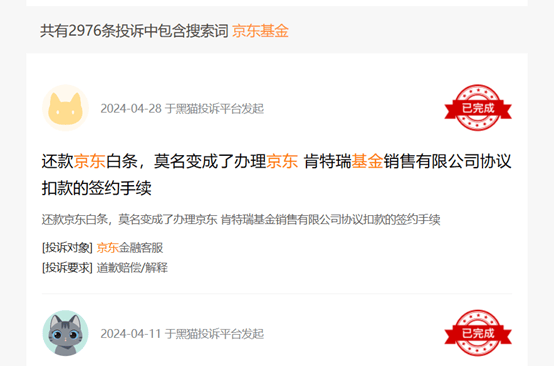 京东金融的这种做法,再次被一众白条用户吐槽“吃相难看”。查询黑猫平台可以发现,京东金融相关的千余条投诉中,有多条涉及在京东白条还款时,莫名捆绑了京东肯特瑞基金销售有限公司协议扣款的基金交易。