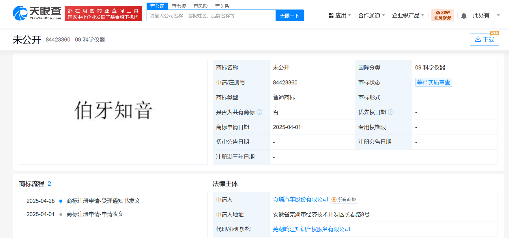 天眼查财产线索信息显示,近日,奇瑞汽车股份有限公司申请注册“奇瑞子期”“子期和鸣”“伯牙知音”商标,国际分类均为科学仪器,当前商标状态均为等待实质审查。