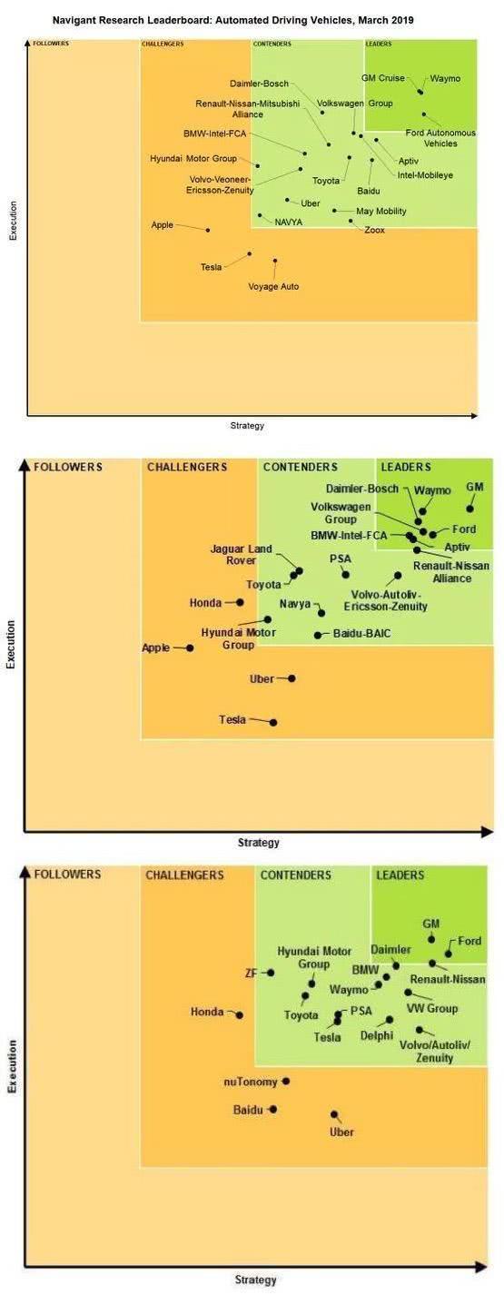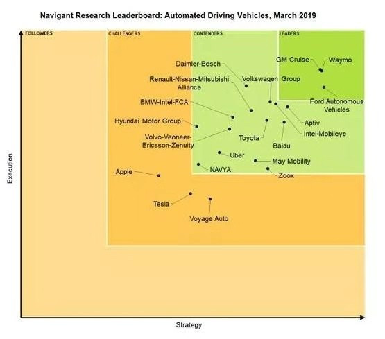 在这份综合榜单中,可以看到:在2017年还尚处竞争者梯队的标致雪铁龙、捷豹路虎等传统车企,今年已被Navigant Research踢出榜单;而即使是去年还是领导者梯队的戴姆勒-博世联盟、大众集团、宝马-英特尔-FCA、雷诺-日产-三菱以及Aptiv,在今年也已跌至了竞争者”队列。