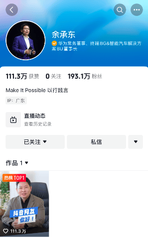 余承东发布首条抖音视频 粉丝数超190万快讯