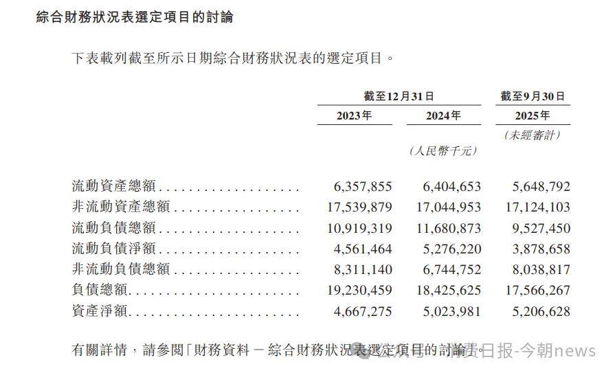 据财报显示,2023-2025年9月30日,公司连续多年出现流动负债净额,分别为45.615亿元、52.762亿元、38.787亿元,主要依赖银行借款及经营现金流维持运营。