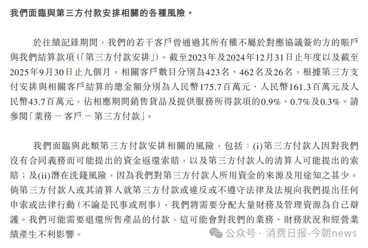 截至2025年9月30日,有26名客户通过非协议签约方账户结算,涉及金额4370万元。这种第三方付款安排可能引发资金返还索赔,且因公司对第三方付款人资金来源及用途缺乏有效核查,存在涉嫌洗钱的合规风险。