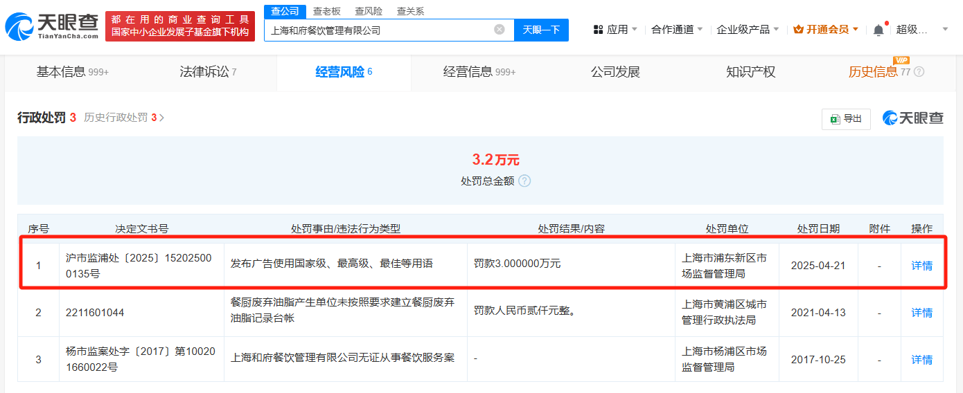 天眼查深度风险信息显示,近日,上海和府餐饮管理有限公司因违反广告法,被上海市浦东新区市场监督管理局罚款3万元。
