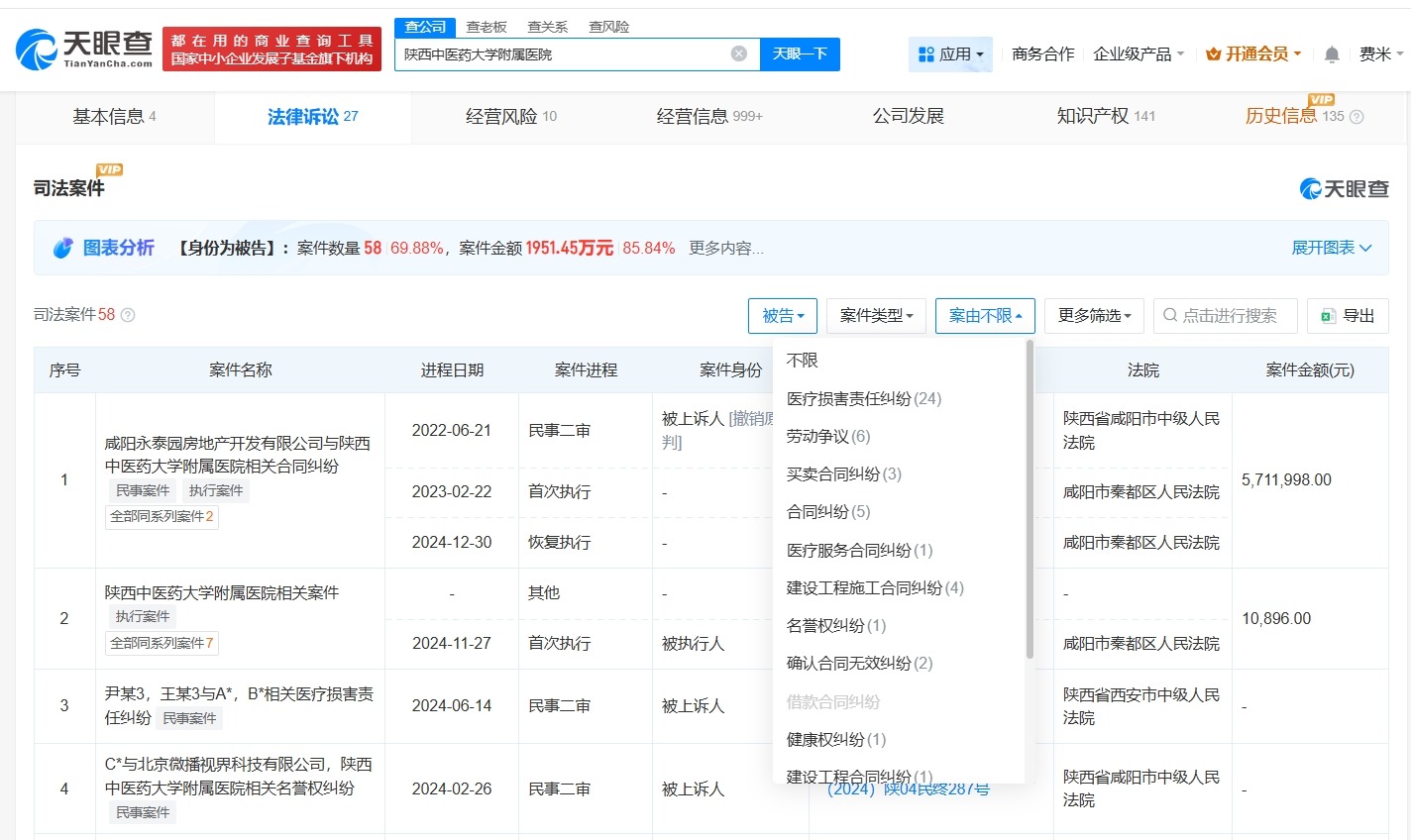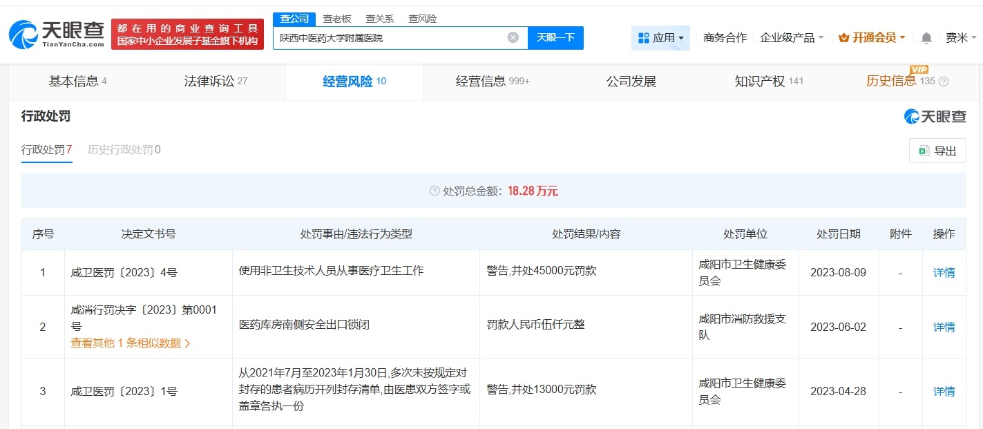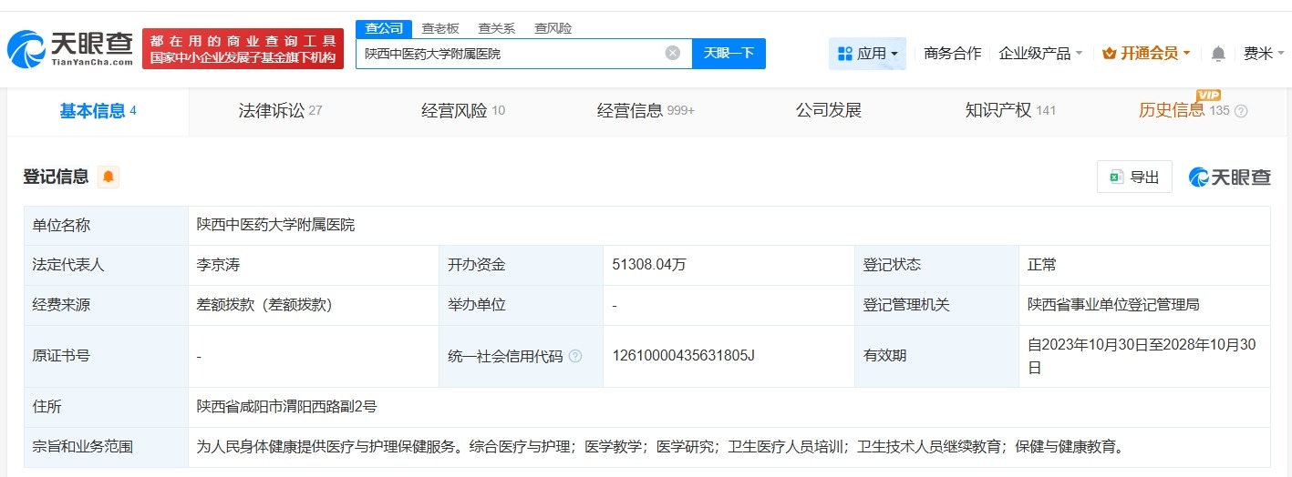 天眼查App显示,涉事医院陕西中医药大学附属医院法定代表人为李京涛,开办资金约5.1亿人民币,宗旨和业务范围包括综合医疗与护理、医学教学、医学研究等。法律诉讼信息显示,该医院曾因医疗损害责任纠纷、名誉权纠纷、健康权纠纷等被起诉。经营风险信息显示,该医院现存多条行政处罚信息。