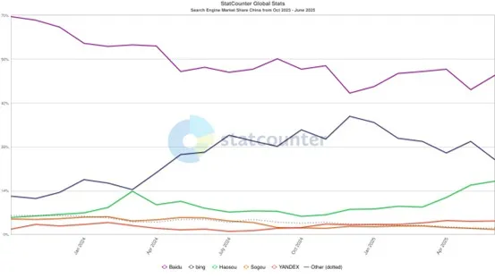 Statcounter的数据显示,百度在中国搜索引擎市场的份额从2023年10月的69.63%,跌至2025年6月的50.92%,被夸克等新兴力量逐步蚕食。
