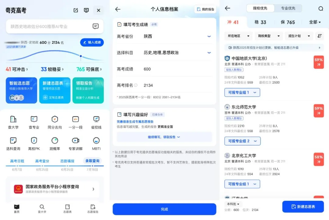 2025年高考季,4000万用户通过夸克高考志愿大模型产生3.5亿次搜索,生成1200万份个性化志愿报告。用户只需输入省份、科目、分数、位次和兴趣偏好,系统就能结合历年录取数据、院校王牌专业、未来就业前景等因素,生成最优志愿方案,把原本需要耗费数周的复杂填报流程,简化为输入信息、接收方案的简单操作。
