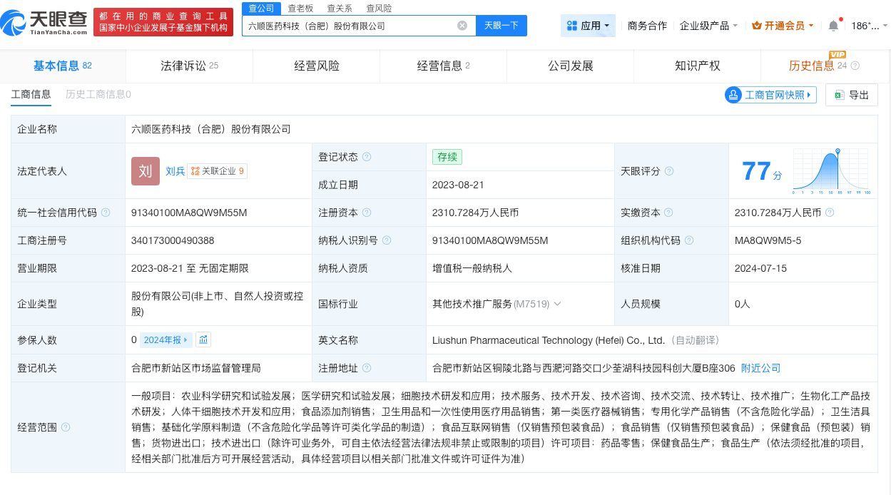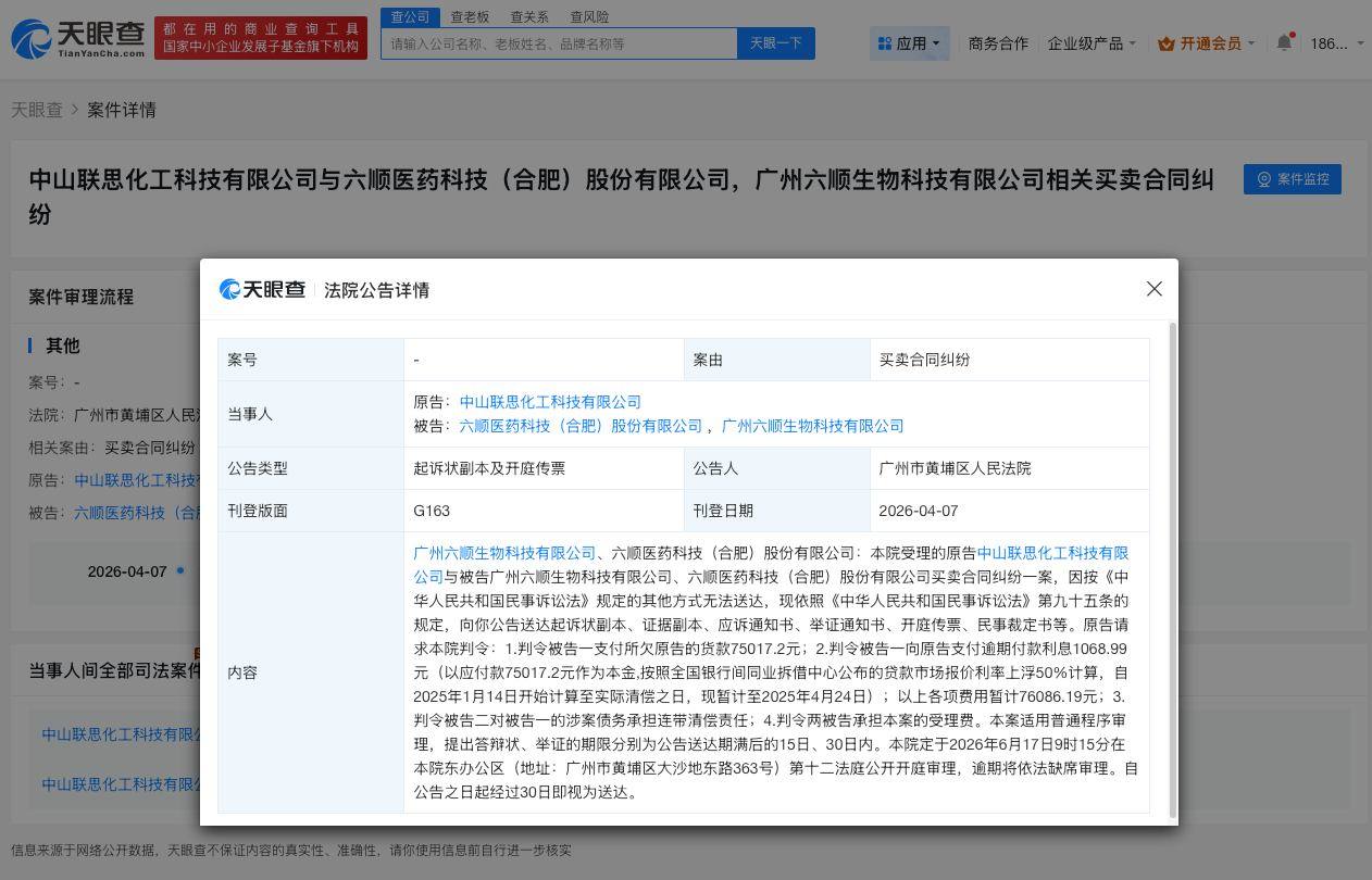 天眼查法律诉讼信息显示,近日,广州市黄埔区人民法院向胡歌持股的六顺医药科技(合肥)股份有限公司及其旗下广州六顺生物科技有限公司公告送达中山联思化工科技有限公司与其买卖合同纠纷一案起诉状副本、开庭传票等。原告请求判令被告支付所欠原告的货款、逾期付款利息合计约7.6万元。法院定于2026年6月17日开庭审理。自公告之日起经过30日即视为送达。风险信息显示,六顺医药科技(合肥)股份有限公司还存在多条被执行人、限制消费令、失信被执行人(老赖)及终本案件信息。