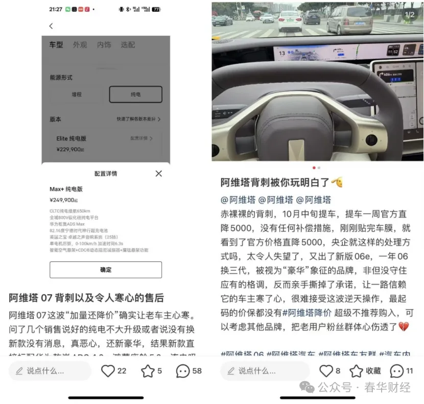 社交平台上,大量车主抱怨被“降价增配”背刺,有车主提及提车阿维塔06不到半月即遭遇官方降价,品牌的价格策略严重伤害了早期用户信任。