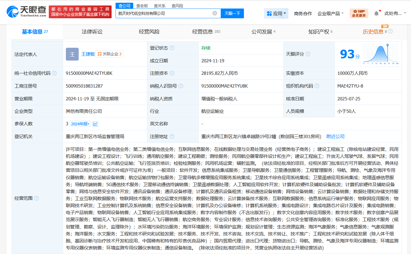 该公司成立于2024年11月,法定代表人为王捷敏,经营范围含互联网信息服务,在线数据处理与交易处理业务,通用航空服务,升放无人驾驶气球、系留气球,民用航空器驾驶员培训,信息系统集成服务,卫星通信服务,人工智能应用软件开发等。股东信息显示,该公司由中国航天旗下中国航天时代电子有限公司、重庆巴山仪器有限责任公司以及北京航天控制仪器研究所共同持股。