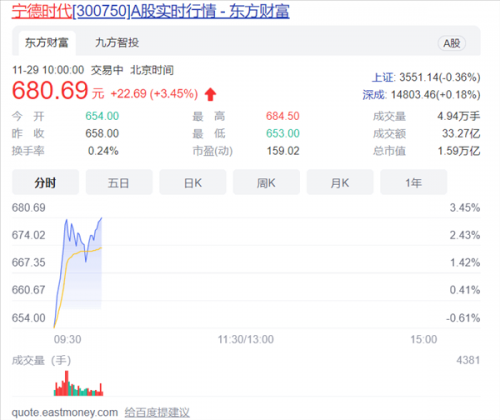 11月20日周一开盘,国内动力电池龙头企业宁德时代继续走高,654元开盘,开盘后股价就开始一路冲高,最高一度来到684.5元,股价又创下了新高,截至发稿,宁德时代的最新股价为680.69元,大涨3.45%。