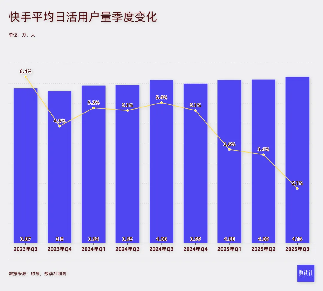 三季度,快手平均日活跃用户数为4.16亿,虽然连续三个季度创下历史新高,但同比增速仅为2.1%,已经处于持续下降的状态。与曾经的竞争对手抖音相比,快手已经被远远甩开。