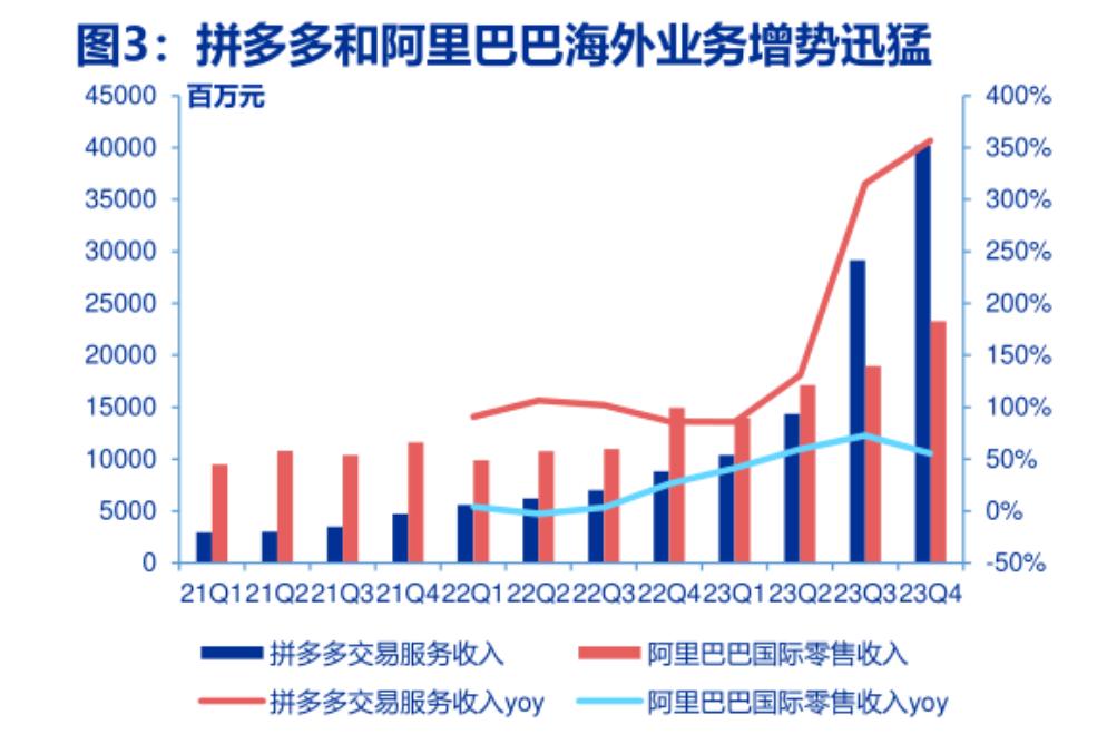 拼多多去年四季度的交易服务收入同比增长了357%,全年同比增长了241%,这部分收入的提升,很大程度上要归功于Temu。根据汇丰银行的估算,Temu在2023年对拼多多集团总收入的贡献为23%,2024年这一数字有望至43%,2025年则将超过50%。