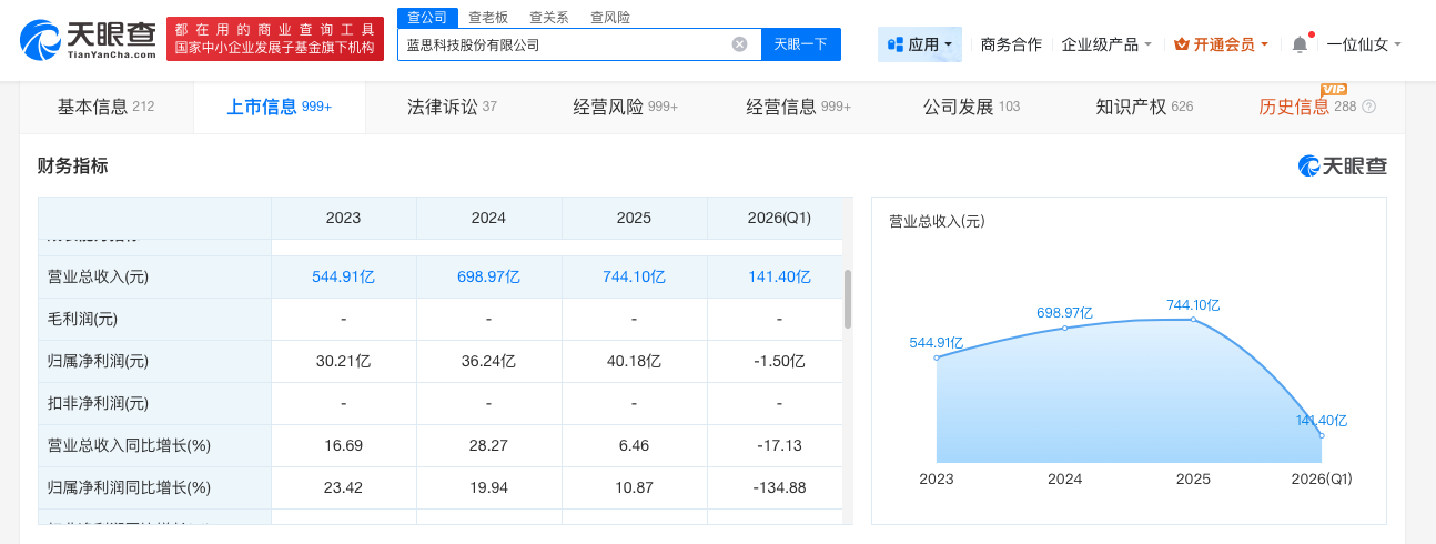 据媒体报道,近日,蓝思科技发布2026年一季报,公司实现营收141.4亿元,同比下降17.13%;归母净利润亏损1.5亿元,而上年同期为盈利4.29亿元。公司表示,一季度业绩承压,主要受智能手机与电脑类收入减少,以及短期汇率大幅波动等因素影响。