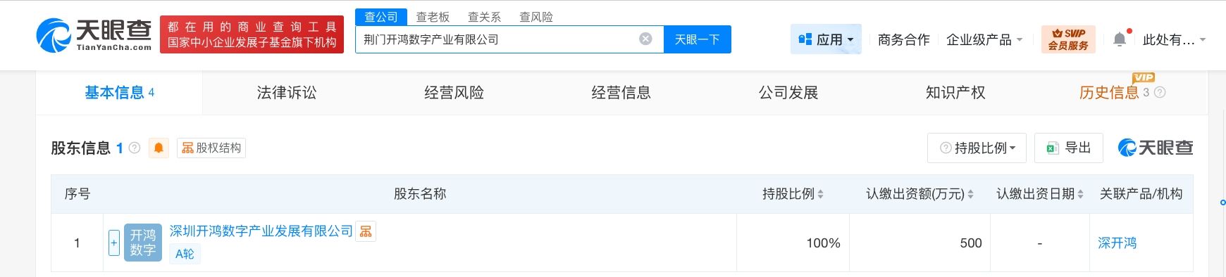 天眼查工商信息显示,近日,荆门开鸿数字产业有限公司成立,法定代表人为王波,注册资本500万人民币,经营范围包括信息系统集成服务、软件开发、物联网技术研发、人工智能行业应用系统集成服务等。股东信息显示,该公司由深圳开鸿数字产业发展有限公司全资持股。