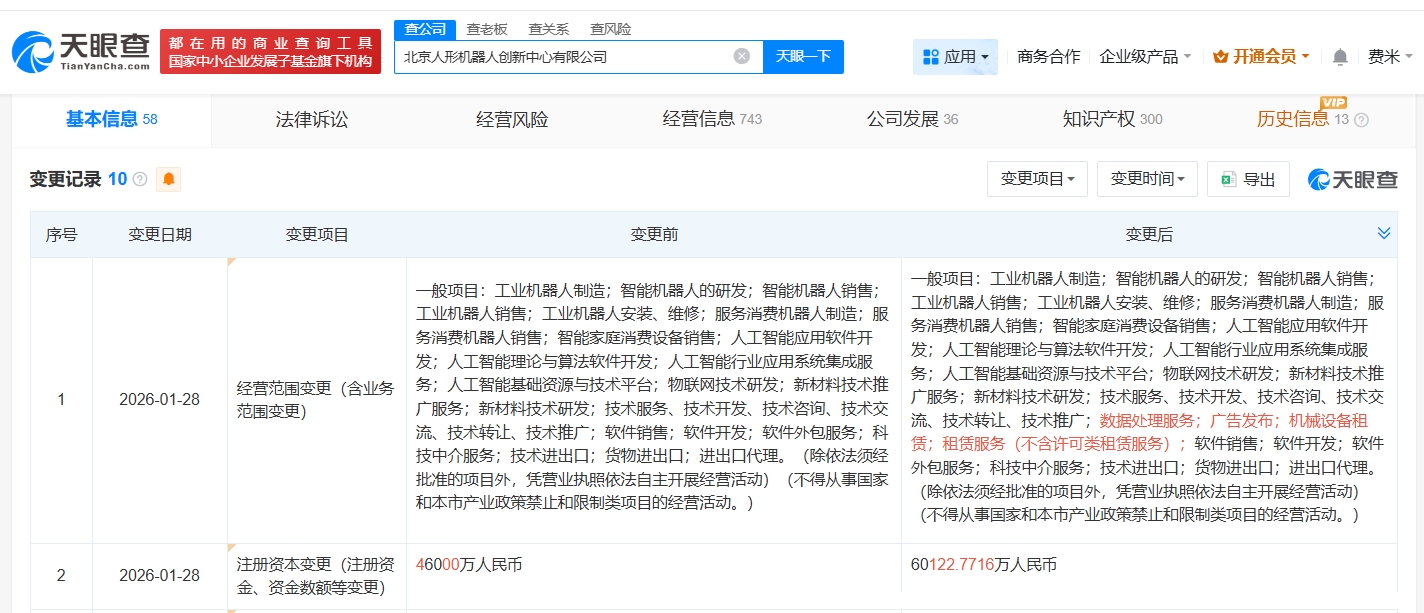 天眼查App显示,近日,北京人形机器人创新中心有限公司发生工商变更,新增北京百度网讯科技有限公司、北京市人工智能产业投资基金(有限合伙)等为股东,同时,注册资本由4.6亿人民币增至约6亿。