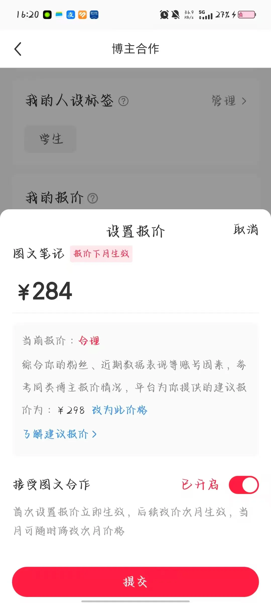 半两财经以博主身份,登录其接广告的“蒲公英平台”后发现,在品牌方主动联系要求推广的情况下,粉丝体量为六千的博主一条种草笔记的报价约为300元;若博主主动联系品牌方,则会赚取相应百分比的佣金,而保健品是其中报价较高的品类之一。