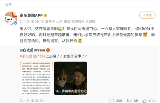 就在10月18日,京东金融还曾紧急辟谣“挤兑”传言,回应称相关言论完全失实,并表示自己“纯属躺枪”。有分析称,或许是有大量用户因不满“杨笠出席活动”赎回理财产品,从而被一些网友称之为“挤兑”。