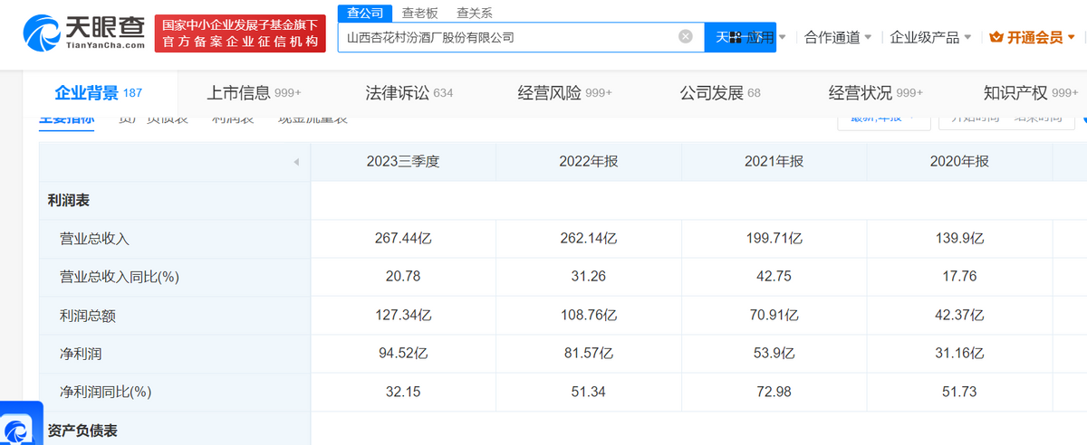 而同期,天眼查APP显示,青花汾酒系列的销售额也首次突破了百亿元。可尴尬的是,其中销售额超过60亿元的是次高端的青花20,而非青花30。并且有券商机构预测,2023年,青花汾酒系列的销售额预计将达到150亿元左右,其中青花汾酒20的销售额还将占据大部分,约为100亿元左右。