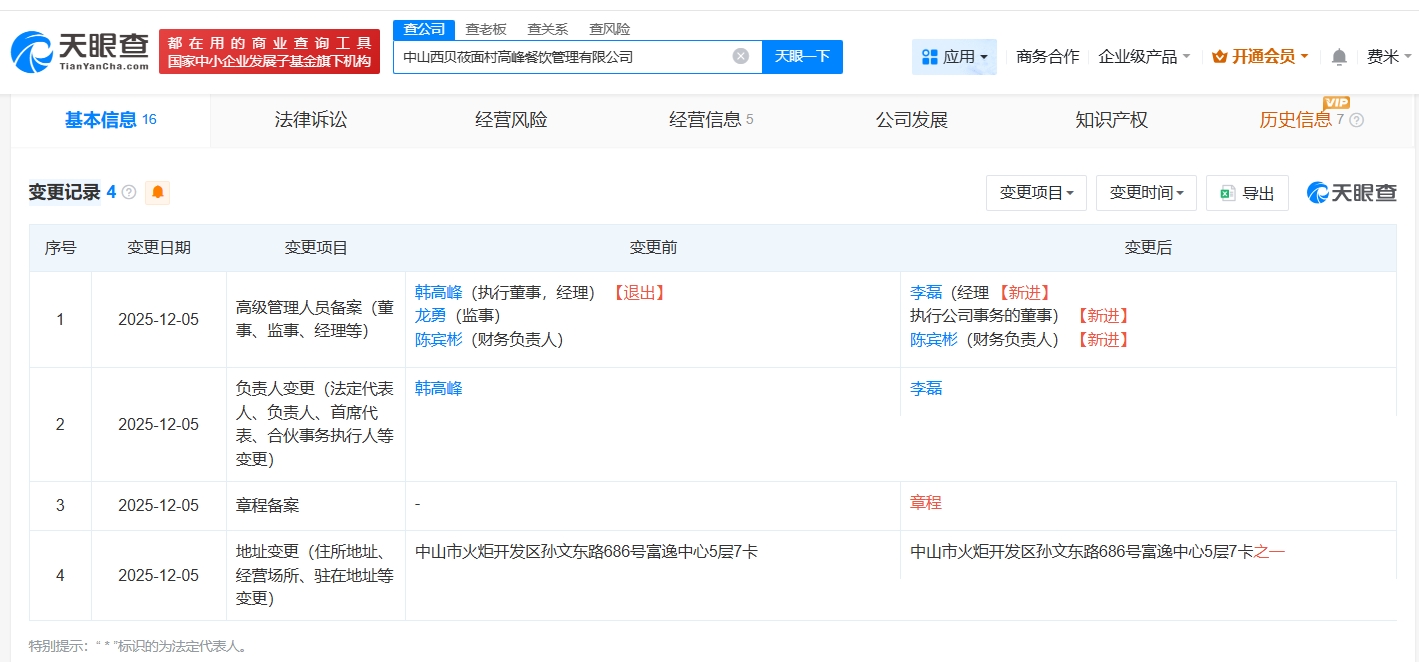 西贝旗下惠州中山公司发生高管变更 西贝旗下两地公司发生高管变更观点