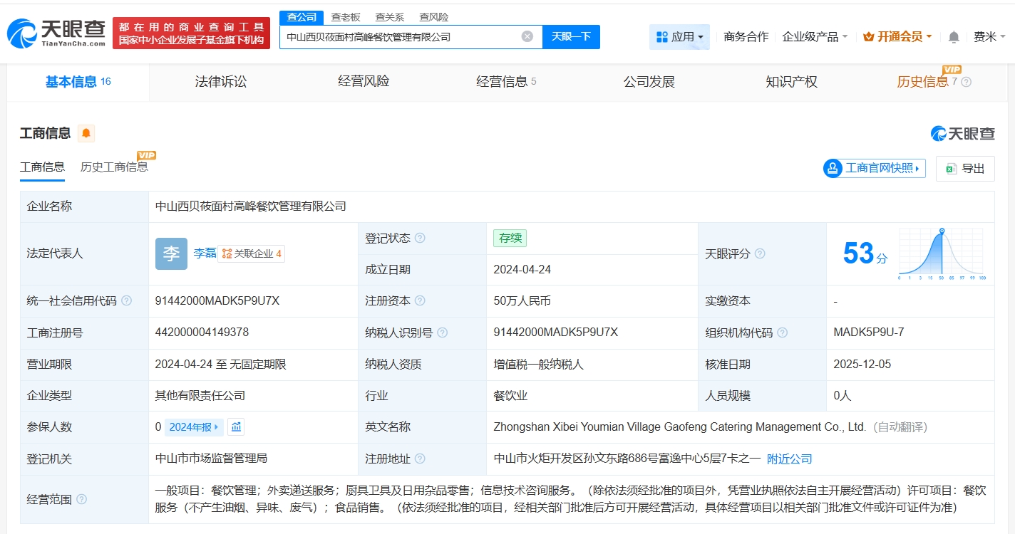 惠州莜面村高峰餐饮管理有限公司、中山西贝莜面村高峰餐饮管理有限公司分别成立于2023年5月、2024年4月,注册资本均为50万人民币,经营范围包括餐饮服务、食品销售等,均由内蒙古西贝餐饮集团有限公司、惠州美西兴惠餐饮管理合伙企业(有限合伙)共同持股。