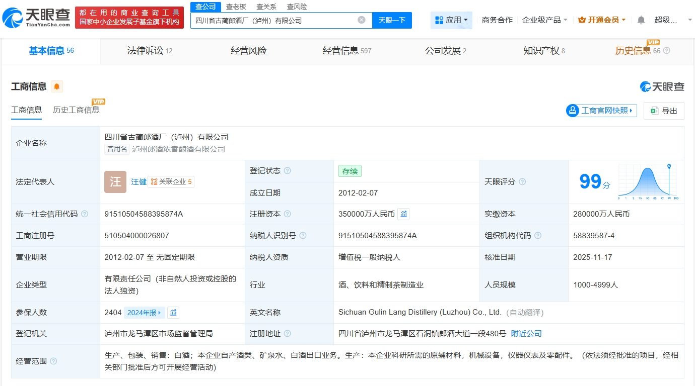 该公司成立于2012年2月,法定代表人为汪健,经营范围包括生产、包装、销售白酒等。股东信息显示,该公司由四川郎酒股份有限公司全资持股。