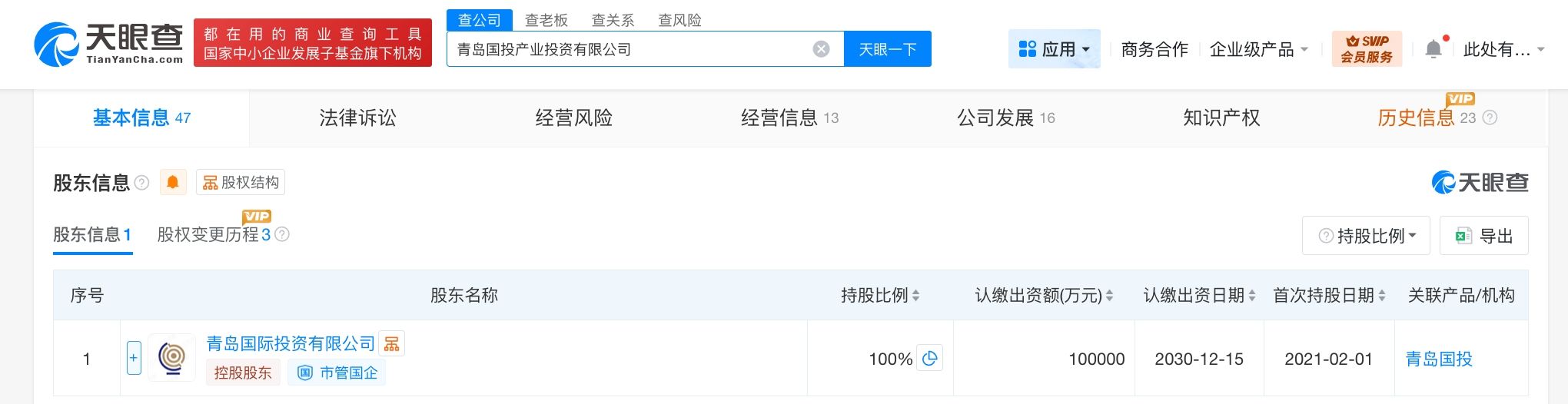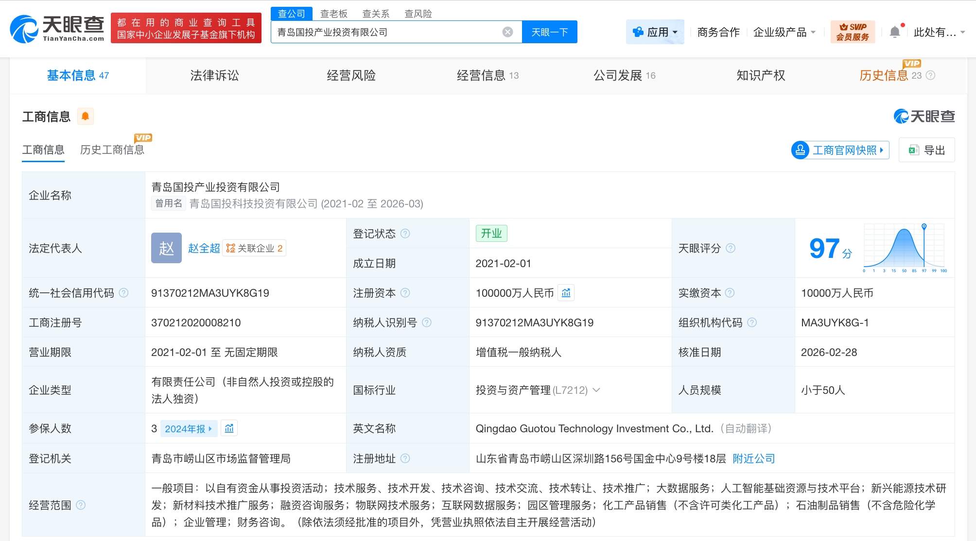 该公司成立于2021年2月,法定代表人为赵全超,经营范围包括以自有资金从事投资活动、大数据服务、新兴能源技术研发等。股东信息显示,该公司由青岛国际投资有限公司全资持股。