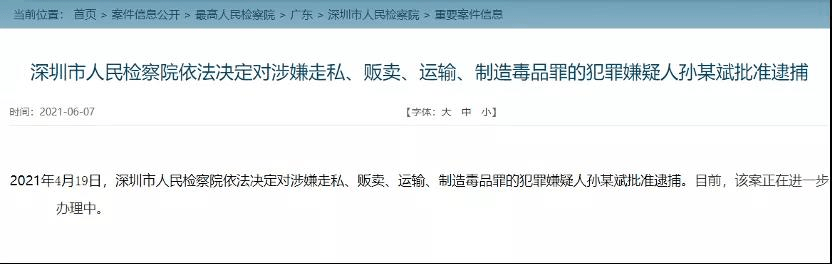 由于涉及毒品成分,检方依法,以走私毒品的名义对孙某进行批捕。据了解,孙某在检察机关的药检中,没有查出吸食毒品,且只买了一瓶药,基本认定药物是其本人治疗抑郁症使用。检察机关对药品进行检测后发现,该员工所购买的药品冰毒成分含量很低,只为1%,基本不能作为毒品使用。孙某案件目前并未审理结束,但可以确认的是,传言中称“已判重刑”、“判处死刑”等说法完全是恶意传谣。