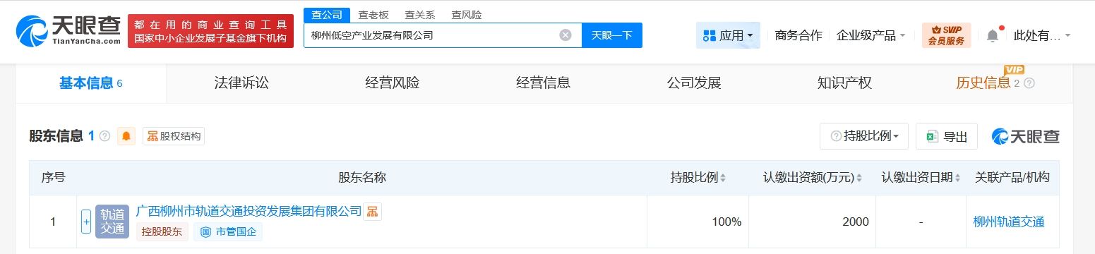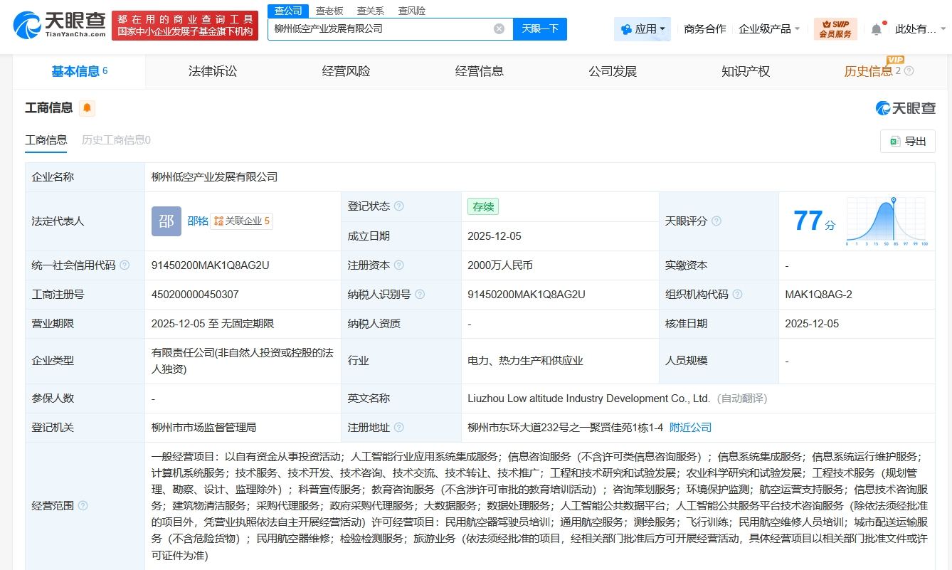 天眼查App显示,近日,柳州低空产业发展有限公司成立,法定代表人为邵铭,注册资本2000万人民币,经营范围含以自有资金从事投资活动、人工智能行业应用系统集成服务、信息咨询服务、信息系统集成服务、信息系统运行维护服务、计算机系统服务、工程和技术研究和试验发展、农业科学研究和试验发展、工程技术服务等。股东信息显示,该公司由广西柳州市轨道交通投资发展集团有限公司全资持股。
