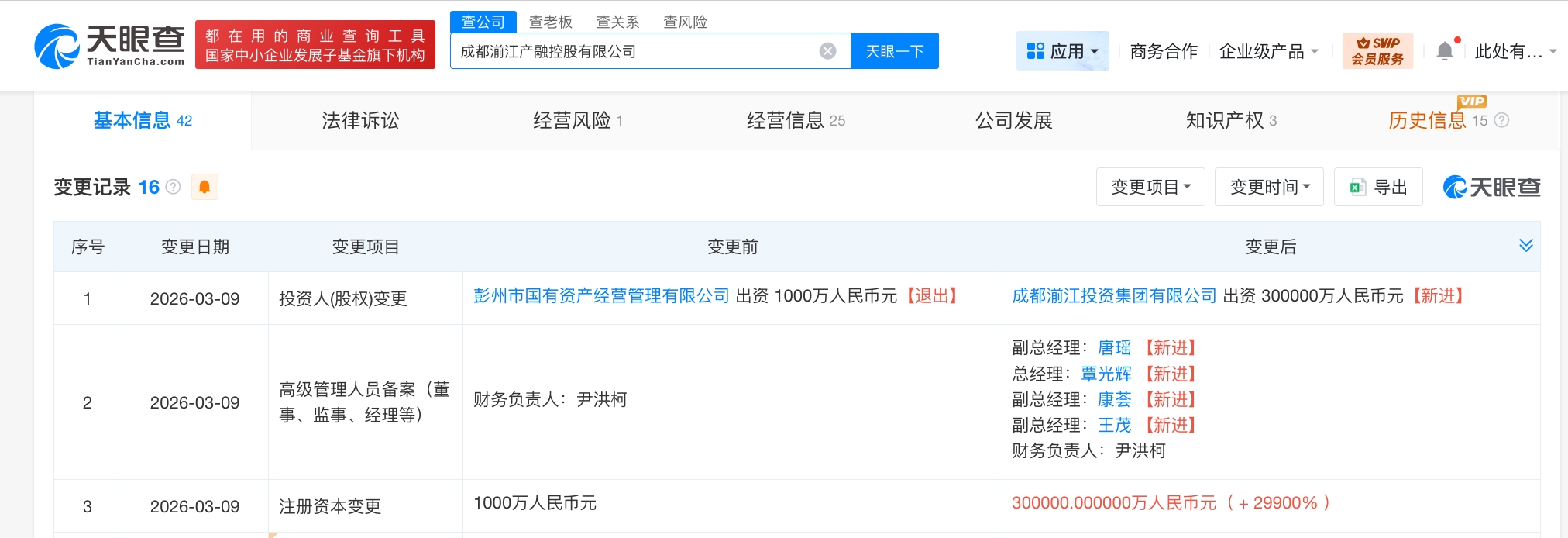 天眼查工商信息显示,近日,成都湔江产融控股有限公司发生工商变更,注册资本由1000万人民币增至30亿人民币,增幅29900%,原股东彭州市国有资产经营管理有限公司退出,新增成都湔江投资集团有限公司为股东并全资持股,同时,多位高管发生变更。