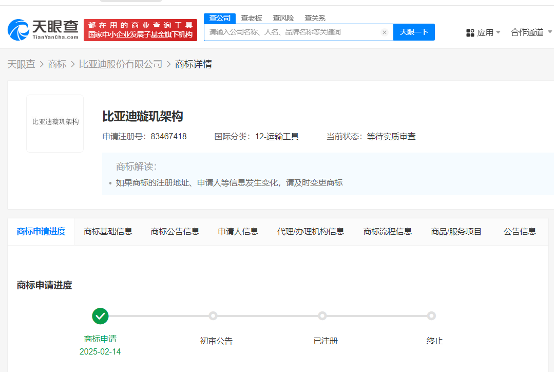 天眼查知识产权信息显示,近日,比亚迪(002594)申请注册一枚“比亚迪璇玑架构”商标,国际分类为运输工具,当前商标状态为等待实质审查。