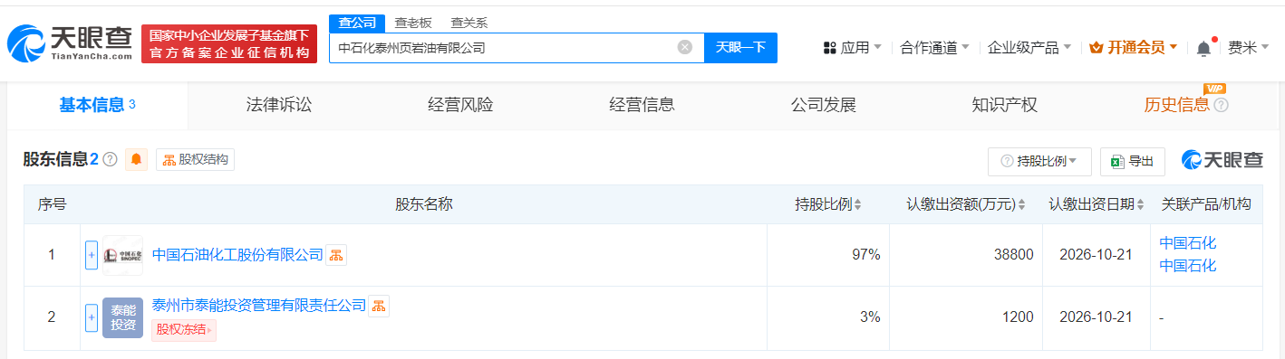 天眼查App显示,近日,中石化泰州页岩油有限公司成立,法定代表人为许国晨,注册资本4亿人民币,经营范围含矿产资源勘查、陆地石油和天然气开采、燃气经营、建设工程施工、港口经营、新兴能源技术研发等。股东信息显示,该公司由中国石化(600028)、泰州市泰能投资管理有限责任公司共同持股。