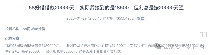 “58好借”到手本金缺斤短两” ,借4万被扣3000被质疑砍头息!观点