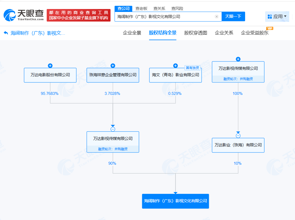 天眼查工商信息显示,近日,海阔制作(广东)影视文化有限公司成立,法定代表人为万翔,注册资本500万人民币,经营范围包括广播电视节目制作经营、电影发行、电影放映等。股权全景穿透图显示,该公司由万达电影(002739)旗下万达影视传媒有限公司、万达影业(珠海)有限公司共同持股。